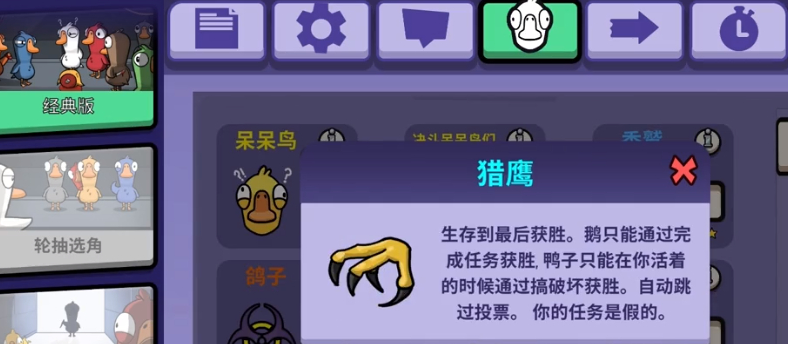 鹅鸭杀可以在线匹配好友开局,是一款十分烧脑的狼人杀游戏,大家需要根据自己的职业进行隐藏,完成任务获得胜利。很多新手玩家对于一些职业玩法不了解,下面小编整理了猎鹰的攻略心得,赶紧来看看吧!