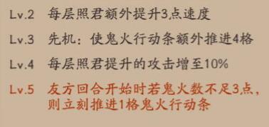 自身回合结束后额外推进3格鬼火行动条并使全体友方获得2层照君;当友方鬼火溢出时若自身未处于控制效果与放逐,则鼓舞全体友方,每溢出1点鬼火使全体友方获得1层照君(当自身照君层数到达上限时不再触发)。