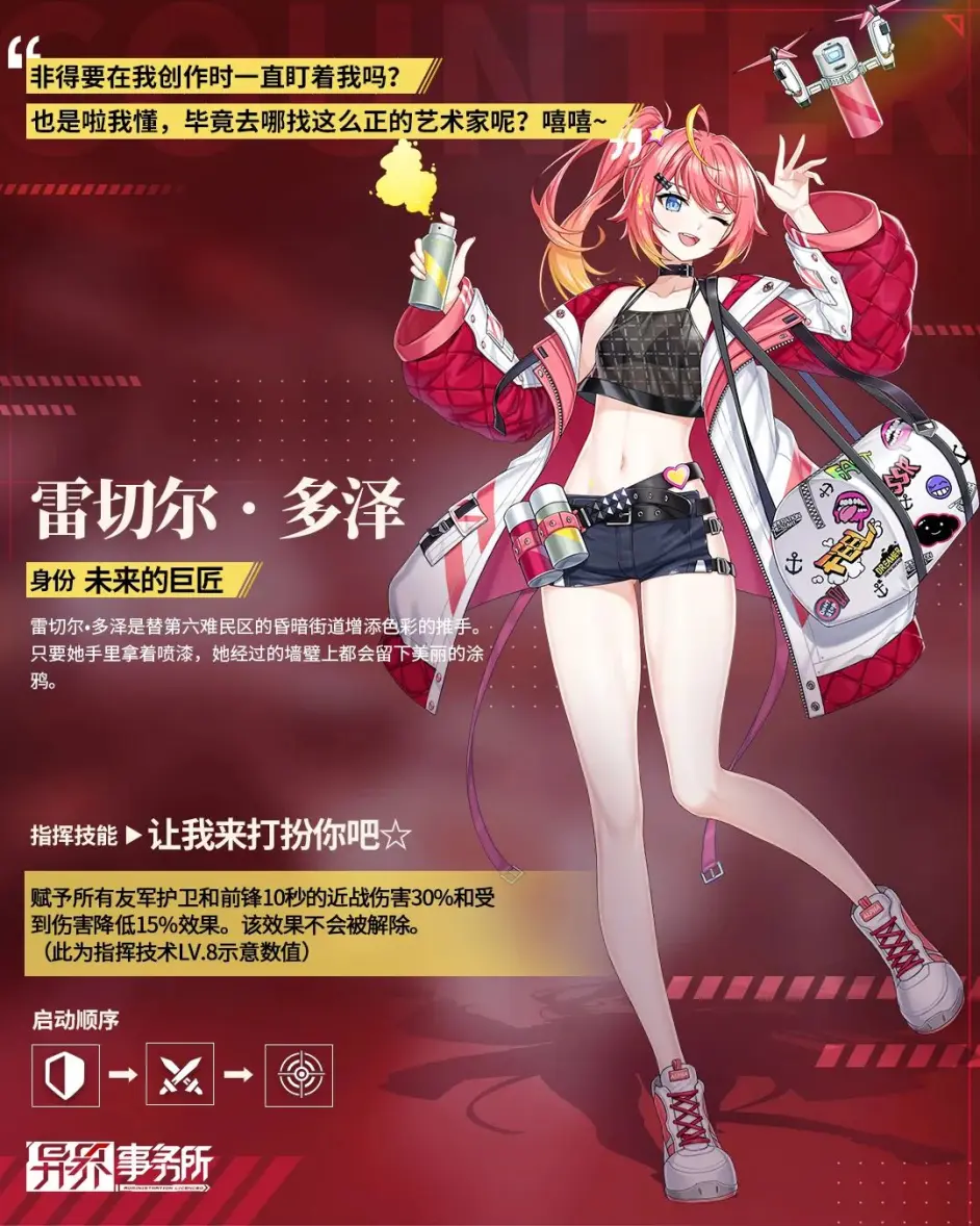 机务员雷切尔多泽的指挥技术可以为友军护卫单位和前锋单位带来增益,老板可根据作战需要进行雇佣以及部署。