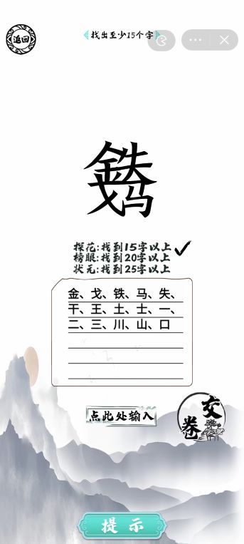 2.游戏开始我们先将比较简单而且容易看出来的字写出来,比如【金、戈、铁、马、失、干、王、土、士、一、二、三、川、山、口】;
