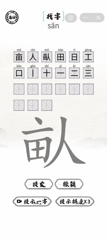 4.然后再仔细寻找,将字里包含的字找出来得到【口、丨、十、一、二、三】