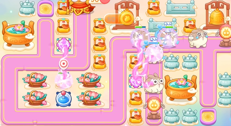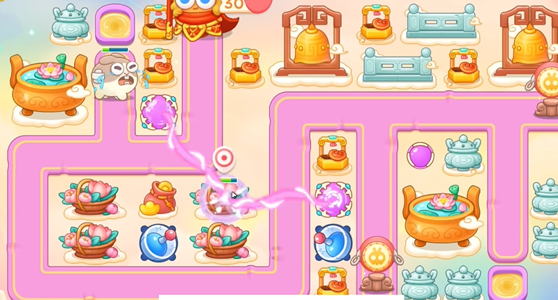 3、中间魔法球打下面篮子,建立雷达,之后打香炉,建立魔法球,第一波留最后一只兔子,打中间障碍物,接着右边魔法球打右边香炉。