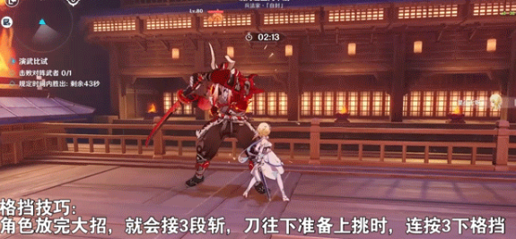 格挡技巧:接角色大招结束后,会放这个技能,看见刀往下准备上挑时,连按3下格挡