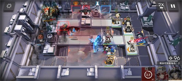 2、开局部署桃金娘(右上),棘棘(向左)、放塞雷娅(向左)、煌(向下)和小羊(向下)。