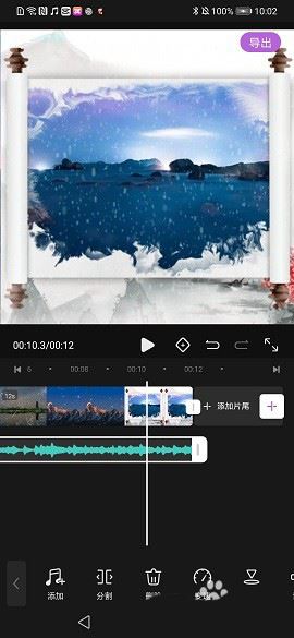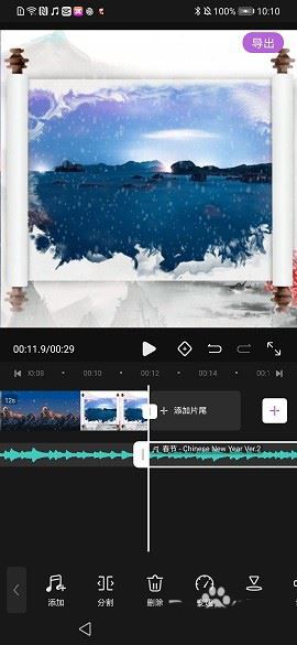 6、如果音频轨道超过主轨道时长,可以使用“分割+删除”去掉多余的音乐段。