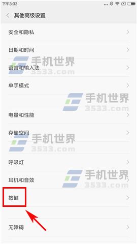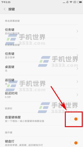 2)接着找到【按键】选项并打开,然后把【音量键唤醒】的开关打开就可以了。(如下图)