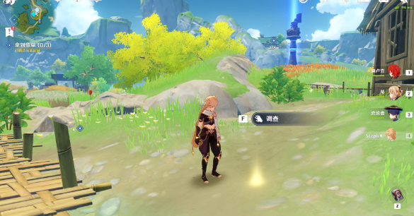 5、传送至荻花洲七天神像处锚点,往前方小屋走去,在屋子旁找到一个发光的调查点,点击调查拿到货单;