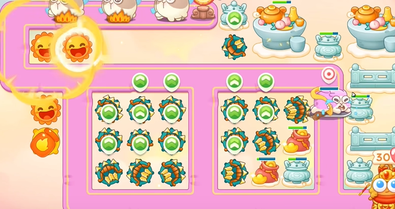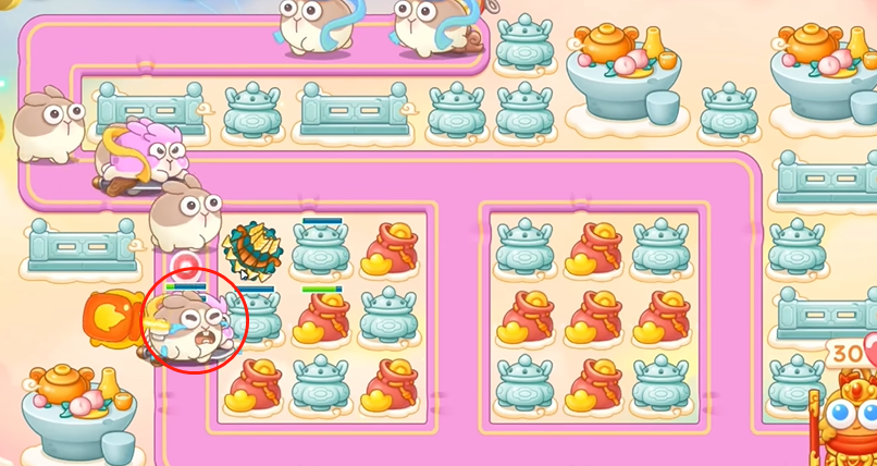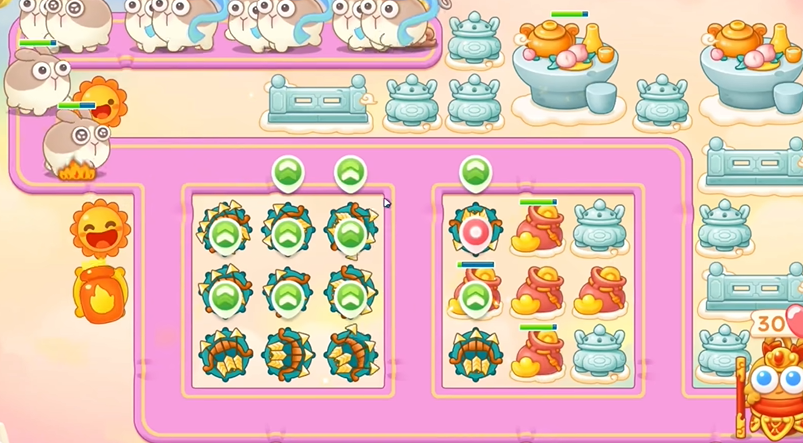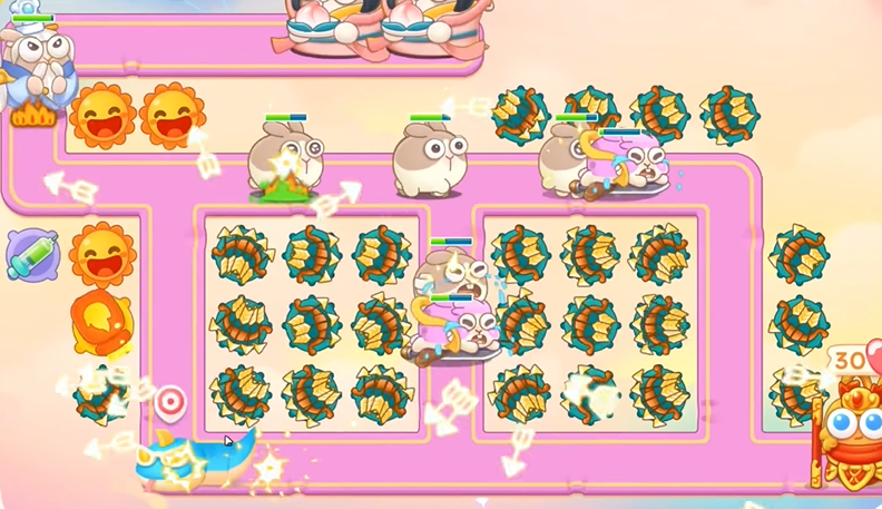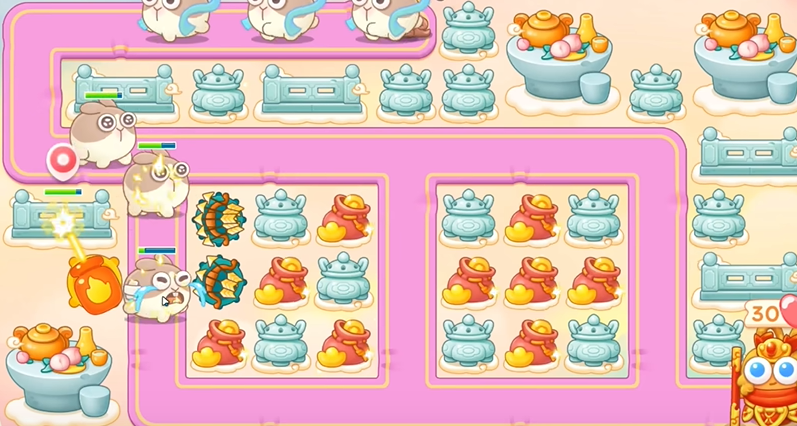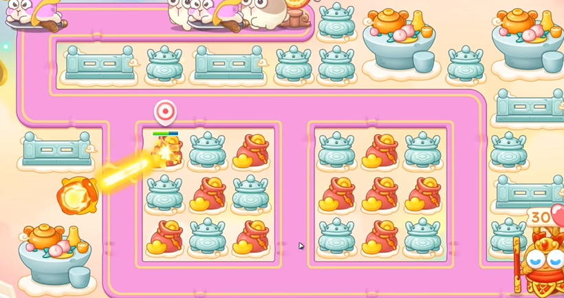 1、建立一个火炮,打钱袋,等到粉兔到了钱袋附近,打粉兔。