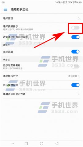 2)接着把【通知亮屏提示】选项右边的开关开启,这样来通知时就会自动亮屏了。(如下图)