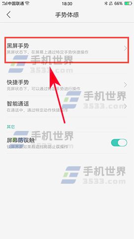 2)接着点击【黑屏手势】,进入黑屏手势界面后先开启黑屏手势的开关,然后选择自己要设置的黑屏手势开启的功能打开旁边的【开关】即可。(如下图)