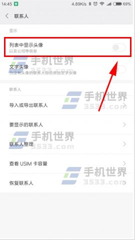 2)进去后找到【联系人】点击进去,最后再点击开启【列表中显示头像】就可以了。(如下图)