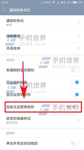 2)接着找到【自定义运营商名称】选项并打开,最后在名称输入框里输入要修改的名称就行了。(如下图)