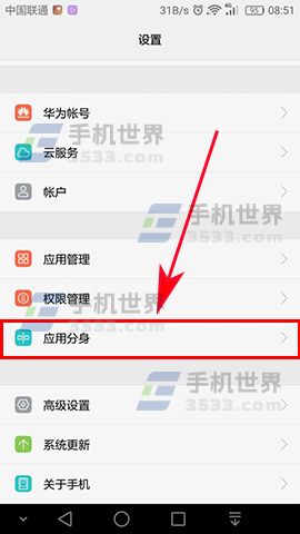 1)点击手机【设置】图标,打开设置菜单后找到并且点击【应用分身】选项。(如下图)
