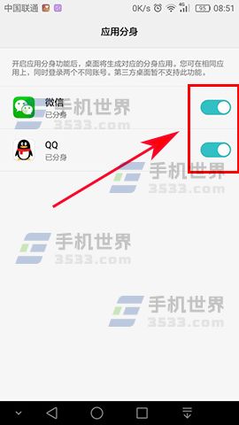 2)接着把需要分身的应用对应的开关打开即可。(如下图)
