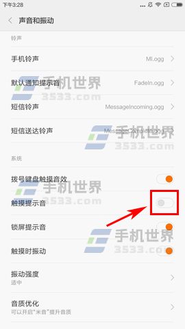 2)接着找到【触摸提示音】并把它右边的开关关闭,这样触摸屏幕时就不会有提示音了。(如下图)