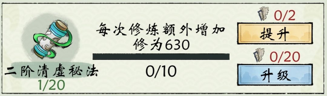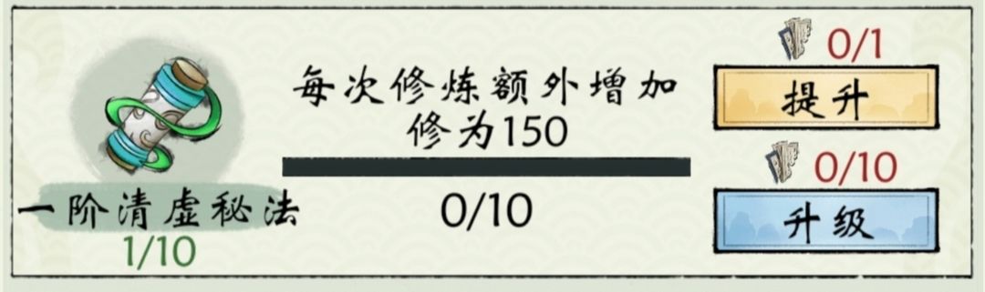 本体120修炼速度,满级10级,每级提升30修炼速度、升级需10个清虚秘法心得,满级共需100个清虚秘法心得,满级420修炼速度。