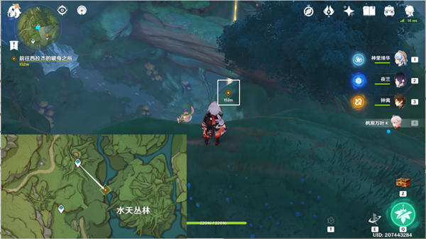 1、传送到水天丛林,朝着东南方向飞过去,来到河道位边上。