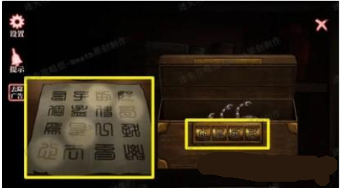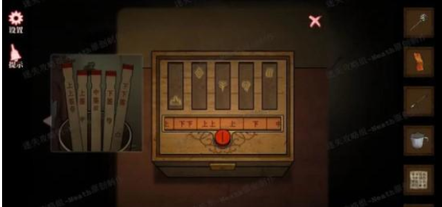 5.点击女人右边的木箱子,根据签筒里的线索调整符号高度,点击红色按钮调整签,密码如下图所示,打开盒子后拿走【蜡烛】。