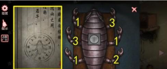 10.向左移动,阅读床头柜上的书本,把【寒铁蝎】放到床上的盒子上,根据书本上的内容,蝎子腿指向数字几就点击几下,下图有标记数字的简易版本,打开盒子拿走【钥匙】。