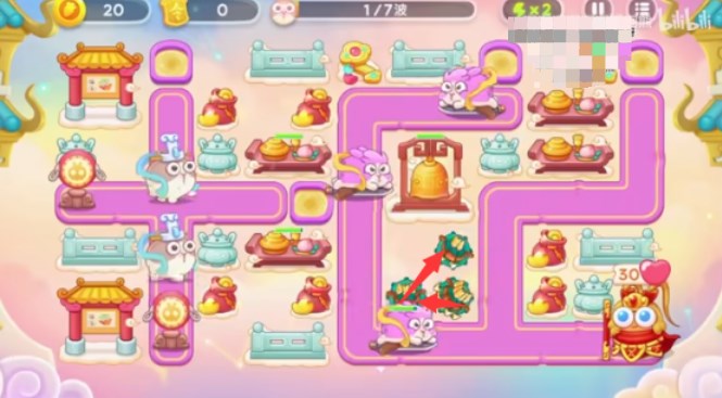 1、开局在右侧放多重箭,先把身边的道具清掉,然后也放多重箭,之后继续清理右侧的钱袋,兔子来了记得锁头;