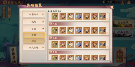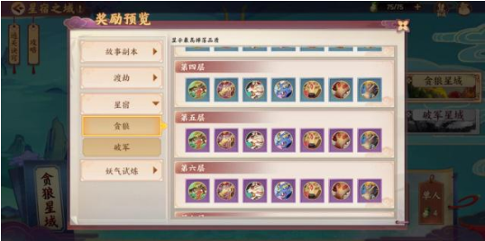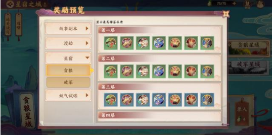 星宿之域分为贪狼星域与破军星宿,两个星域都是10层,层数越高,挑战成功之后获得高级星宿的概率越大。每层设有3波怪,第一第二波是小怪,第三波是BOSS。每一层面对的BOSS虽然都是天枢贪狼,但是它的技能和属性有着细微的差距,总体变化也就是BOSS带有回血、加速、持续伤害+虚弱、破防+眩晕能力这几种。