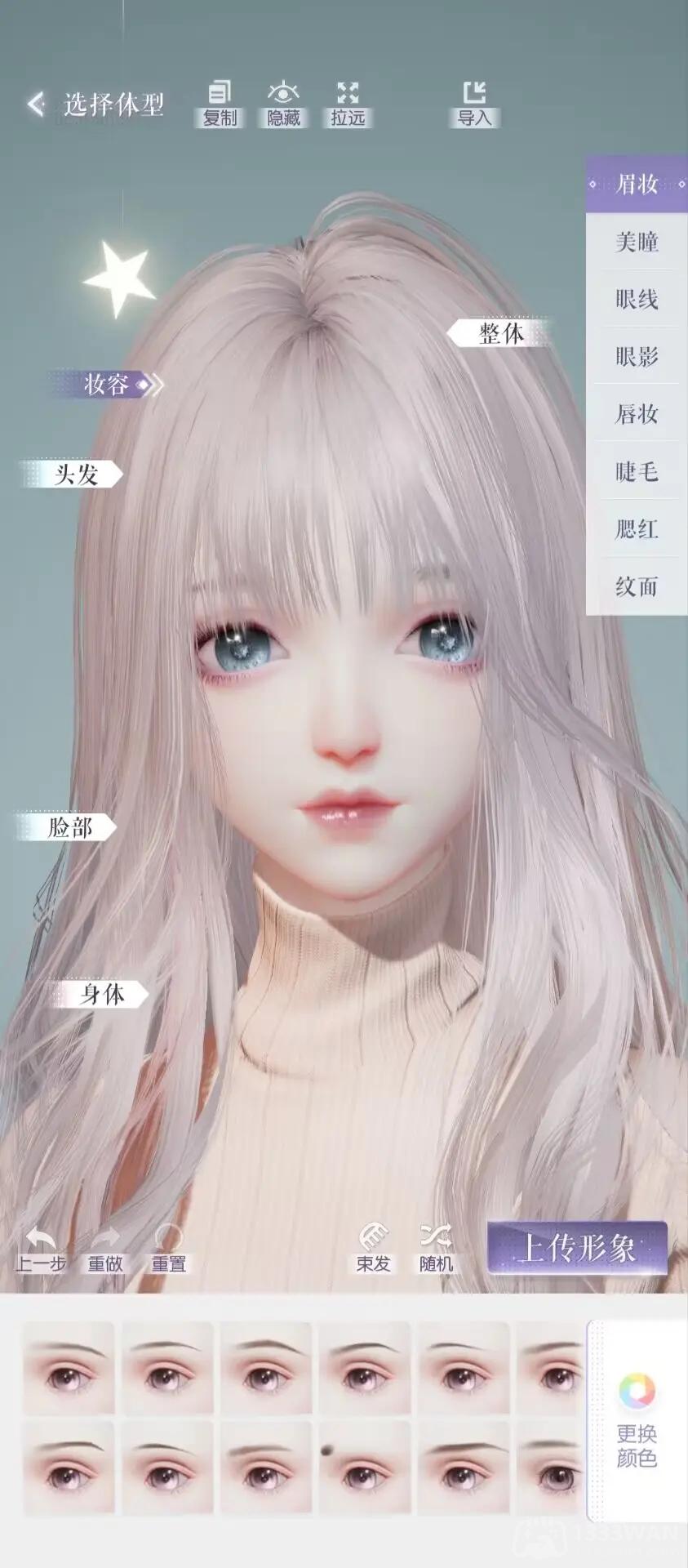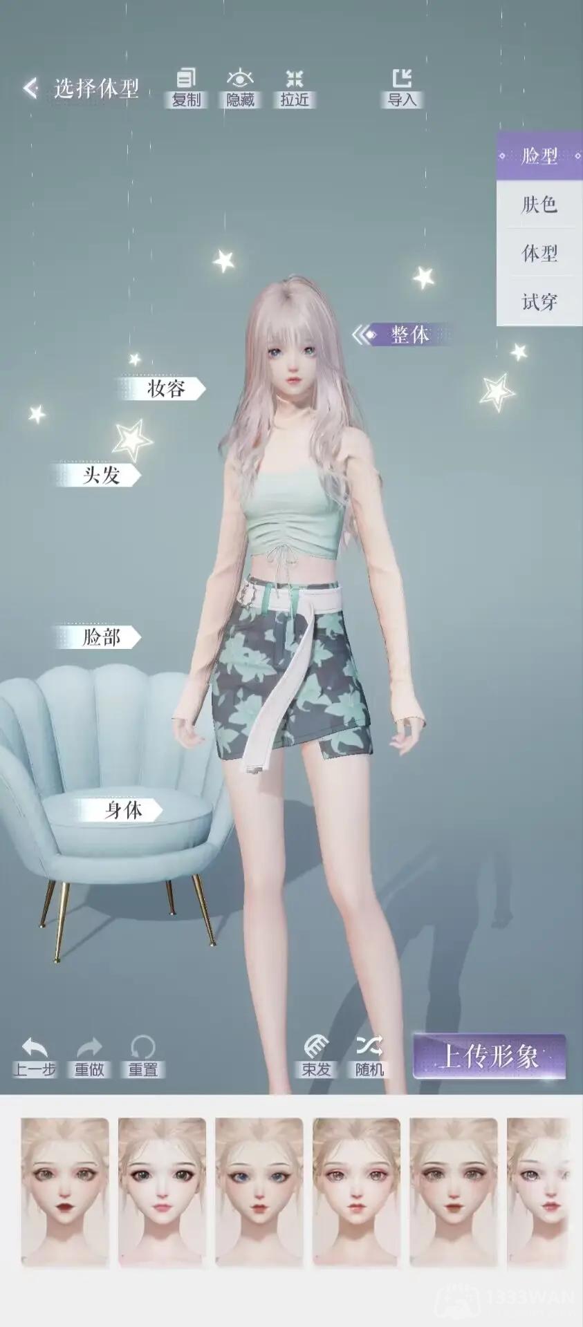 捏脸分为:整体、妆容、头发、脸部、身体5个部分,除此之外,还可更改肤色、体型等。