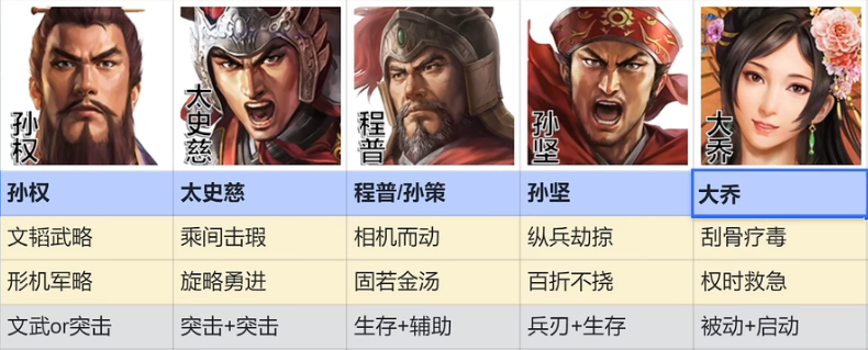 因为孙权太史慈都是弓兵的关系,所以这里辅助位只能用大乔不能用小乔,否则三弓兵太脆很容易被突破前排。同样也是这个原因和火烧流不同,这套阵容里孙坚基本是前排不可或缺的存在(拦路嘲讽),程普也可以换成孙策增加控制(但是御会比较吃紧)。