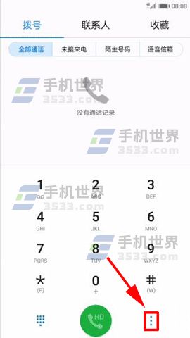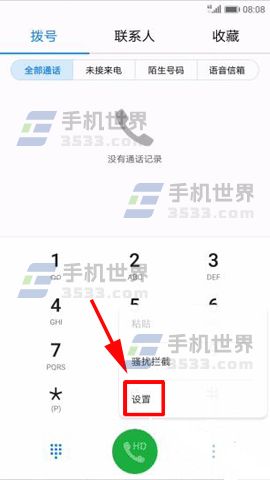1)打开手机进入到电话应用点击右下角的【按钮】进入到设置菜单,弹出二级菜单后再点击进入【设置】功能。(如下图)