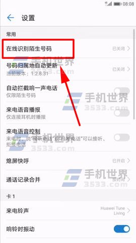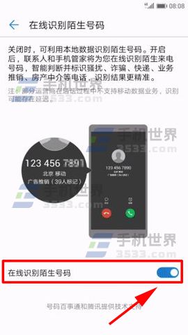 2)随后再点击设置列表中的【在线识别陌生号码】选项,最后点击在线识别陌生号码旁边的按钮就可以开启陌生号码识别功能了。(如下图)
