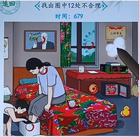 全民汉字王找出图中12处不合理之处包含:足浴桶、电子书、小太阳、扫地机器人、小黄鸭、显卡、摩天轮、神州行、电动车、按摩仪、小冰箱