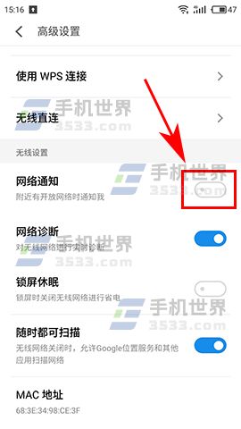 2)接着点击【高级设置】,进入高级设置后再把【网络通知】右边的开关关闭,这样就不会再接收到该通知了。(如下图)