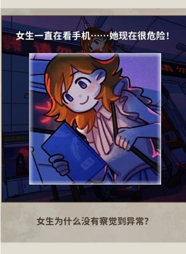 4,女生为什么没有察觉到危险?这是因为女生一直在看手机,所以她现在很危险。