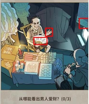 2、从哪里可以看出老板爱财?看到这个扇子上、这个手势4万和墙上的2万。