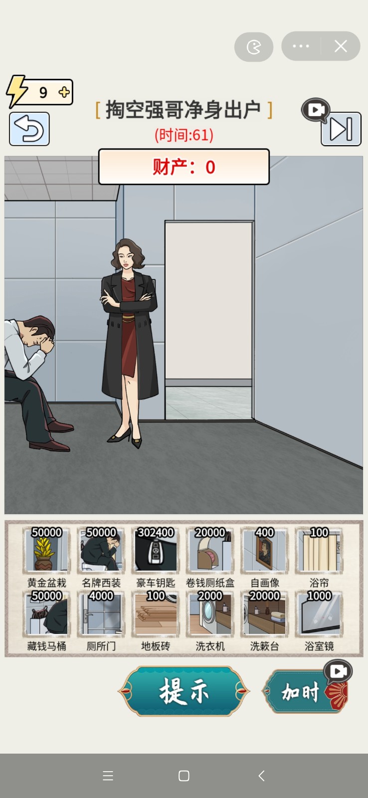 :黄金盆栽、名牌西装、豪车钥匙、卷钱厕纸盒、白画像、浴帘、藏钱马桶、厕所门、地板砖、洗衣机、洗漱台、浴室镜