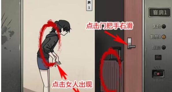 2、客房:点击女人找到怪异的女人,点击门把手右滑可以找到行李箱,地上有人影