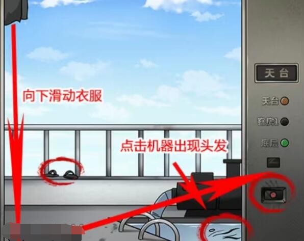 3、天台:栏杆处有拖鞋,点击机器水池出现头发,电梯按钮处有手印,向下滑动衣服再拖动里面的房卡解锁底层