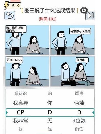 1、这一关需要帮助这个游戏角色谈到恋爱,既然游戏角色都已经上去问了谈不谈恋爱,然后女孩也是说了你可以试试,那么这边就是需要玩家前往找到正确答案CPDD才可以通过。