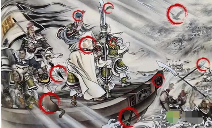 2、关羽头上是帽子,左边的士兵拿着毛笔,脚下是橘黑猫,关羽衣服上画着橘猫,刀旁边有毛豆