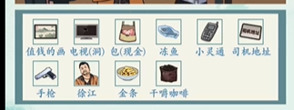 答案:值钱的画、电视、包、冻鱼、小灵通、司机地址、手枪、徐江、金条、干嚼咖啡