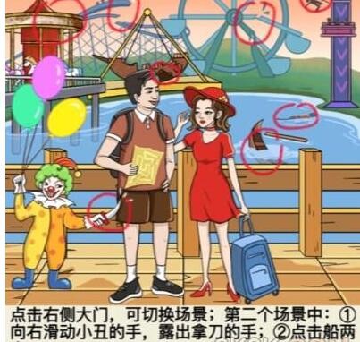 2、然后点击大门可以切换场景,可以找到生锈的马、过山车断裂、摩天轮脱落、跳楼机、破洞、漂浮的人。