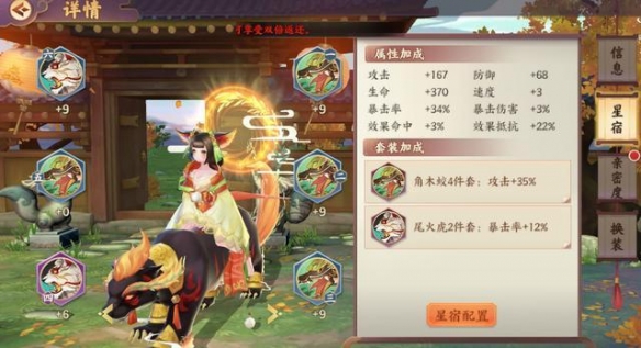 星宿是每升3级会获得一个额外属性,目前符灵还是分为三大类,攻击型、辅助型和坦克型,输出型符灵优先考虑的属性:暴击率套装(尾火虎)攻击力加成套装(角木蛟)爆伤套装(奎木狼)吸血套装(女土蝠)首回合爆发套装(亢金龙),辅助类符灵优先考虑的属性:首回合群伤免疫(柳土獐)速度加成套装(箕水豹)生命加成套装(室火猪)命中效果加成套装(鬼金羊)坦克类符灵优先考虑的属性:防御加成套装(牛金牛)效果抵抗加成(井木犴)反击加成套装(斗木獬)生命加成套装(室火猪)。如果实在不知道怎么弄,就记住输出类的主属性优先攻击,副属性暴击,速度类的就是速度为主,其次选择生命。