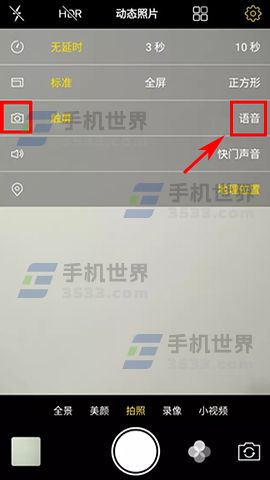 2)这时就会弹出相机设置菜单,我们看到相机图标这一行,点击【语音】,选中后快门按钮上就会多一个麦克风图标,这时就说明已经开启声控拍照了,拍照时只需说出【拍照】或者【茄子】,相机就会自动拍照。(如下图)