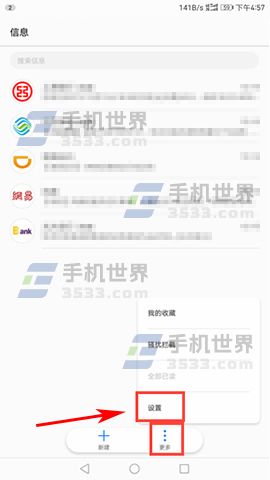 1)打开【信息】应用,进入信息界面后点击右下角的【更多】,再点击【设置】按钮。(如下图)