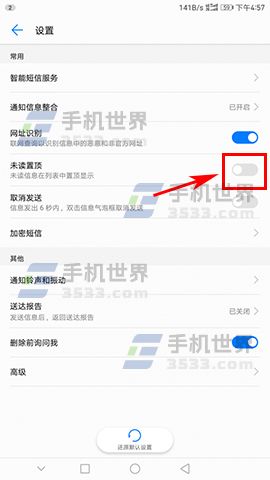 华为麦芒6自动置顶未读信息教程。手机在使用的过程中会接收到很多信息,而有部分用户在查看信息的时候是从通知中心点击查看的,但又不是每条都查看,有些觉得不怎么重要的就直接清除通知了,对此我们可以开启未读信息置顶功能,这样我们打开信息应用是就可以看到未读的信息了,就不用一条条的去翻看了。