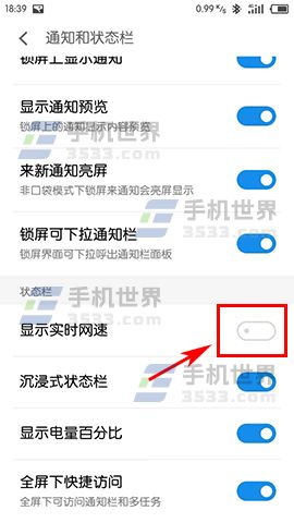 2)最后滑动屏幕找到【显示实时网速】功能点击旁边的按钮开启就可以再状态栏中显示实时的网络速度了。(如下图)