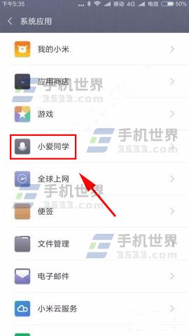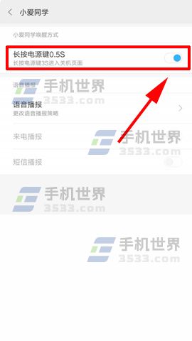 2)随后滑动列表找到【小爱同学】应用,进去后再点击【长按电源键0.5S】旁边的按钮即可开启电源键唤醒了。(如下图)
