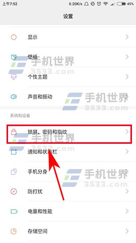 1)打开手机的【设置】菜单,进入设置菜单后点击【锁屏、密码和指纹】选项。(如下图)