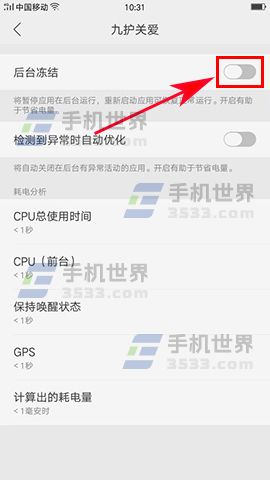 2)接着找到要设置的应用名称,点击打开后,分别把【后台冻结】以及【检测到异常时自动优化】两个选项的开关都关闭,这样就不会被系统自动关闭结束了。(如下图)