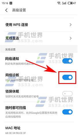 2)接着点击【高级设置】,进入高级设置界面后就可以看到【网络诊断】,把它右边的开关打开就行了。(如下图)