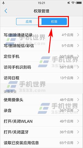 2)接着点击【权限管理】,进入后点击上方的【权限】标签,这时就能看到每项权限对应的应用数量了,如果要修改设置,直接点击权限类型,再对相关应用进行管理就行了。(如下图)